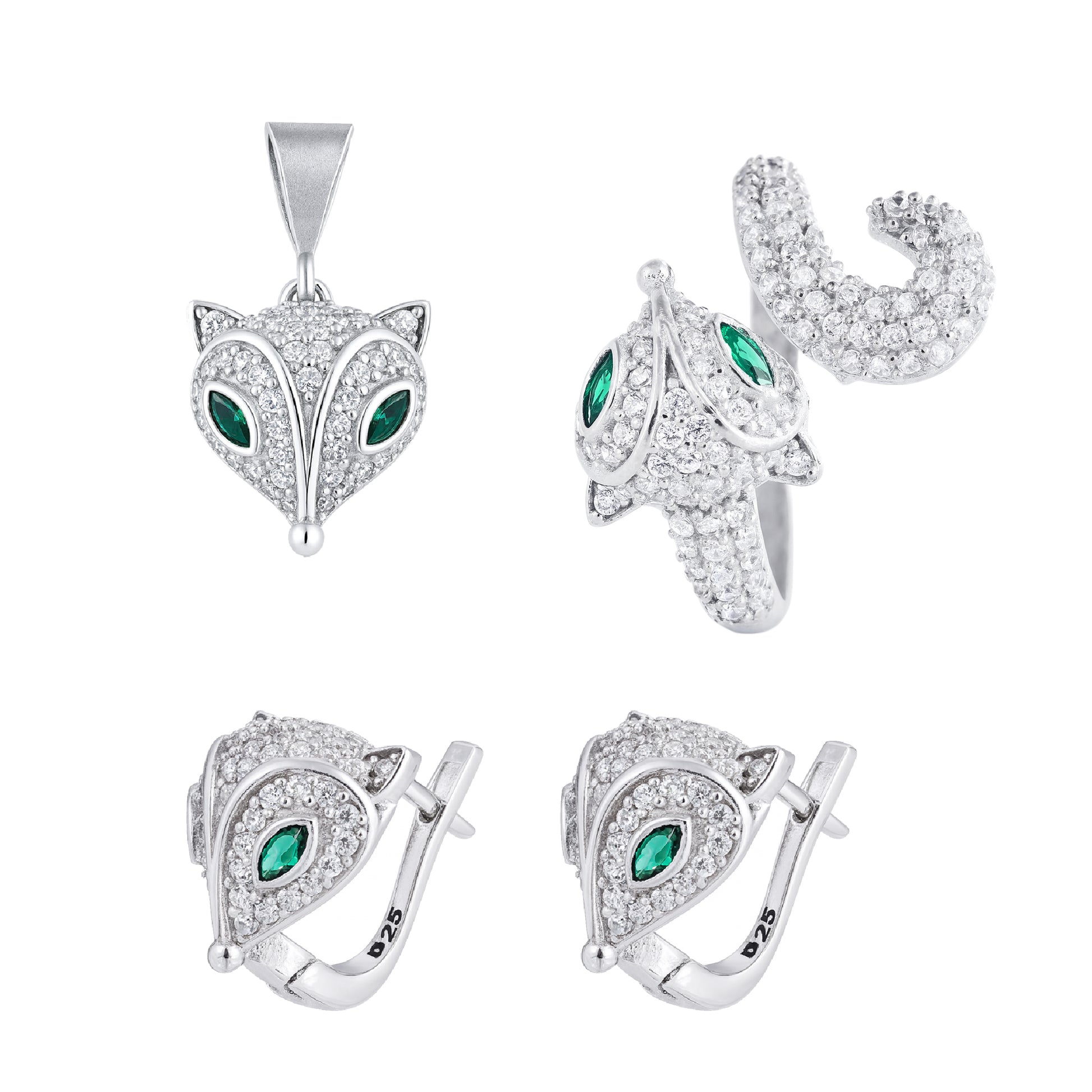 Fox Tail Pendant, Ring & Earrings with Green Eyes in 925 Silver